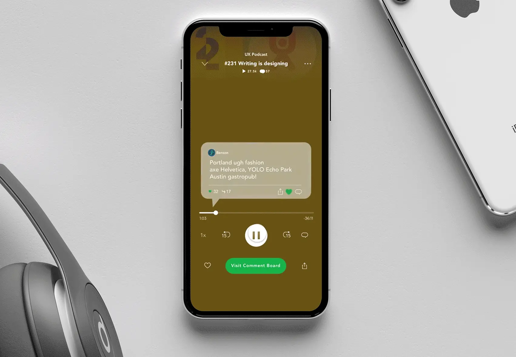 Podcasts often play during screenless moments. To introduce users to the comment board, selected comments can pop up while the podcast is playing. This peek into the ongoing dialogue encourages active participation.