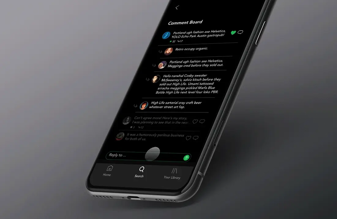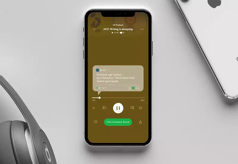 Podcasts often play during screenless moments. To introduce users to the comment board, selected comments can pop up while the podcast is playing. This sneak peek into the ongoing dialogue encourages active participation.